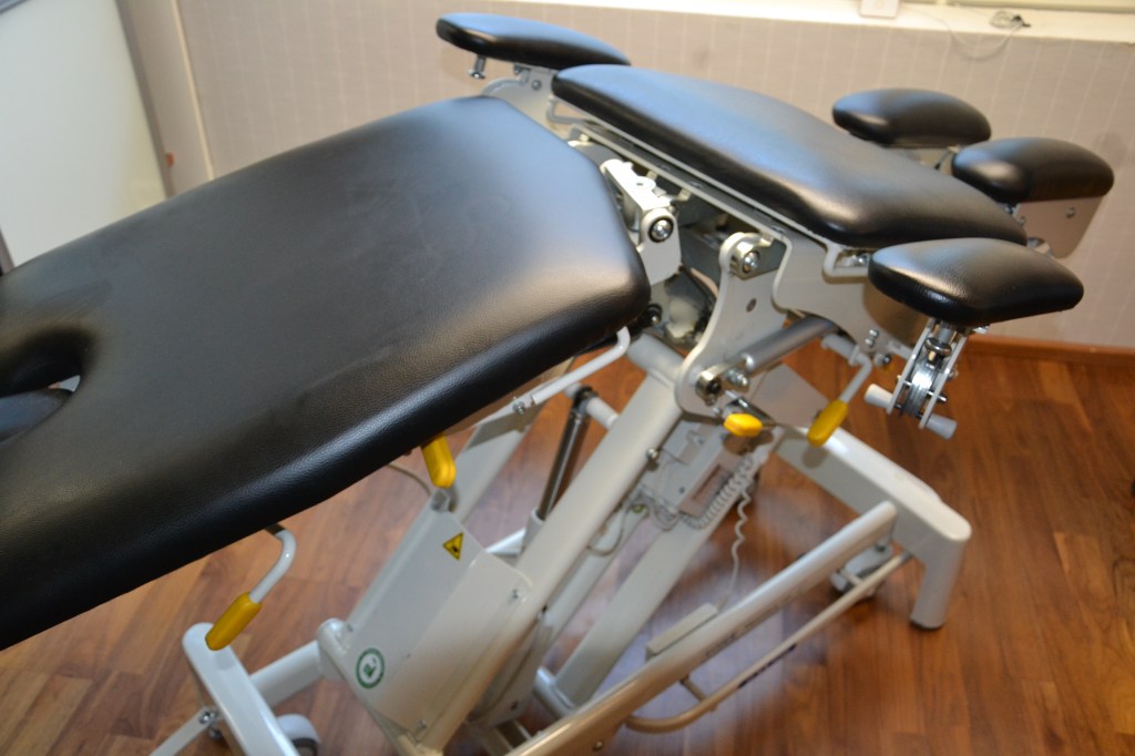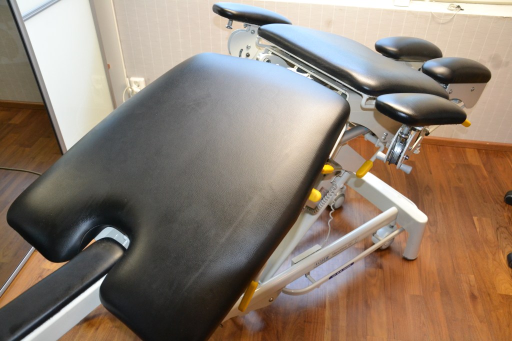 Kun asiakkaan lihas- ja faskiakireydet on vapautettu hieronnalla niin sen jälkeen hoito tarkoitukseen suunnitellulla pöydällä on helppoa ja tehokasta. Tähän saakka olen hoitanut scolioosia niin, että asiakas istuu jakkaralla ja minä istun asiakkaan takana käsittelemässä selkää. Hoito on raskaampaa. Nyt hoitoon saadaan veto ja kallistus mukaan. Tulos on nopeampi saavuttaa.